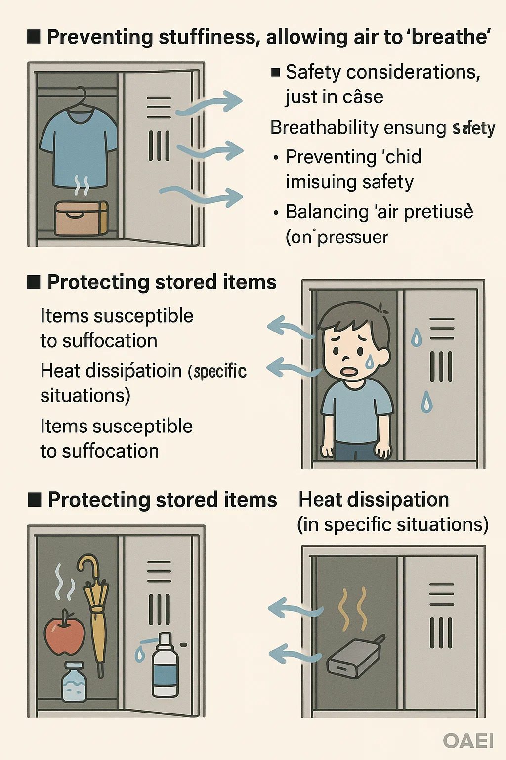 Az „izzadtság” megelőzése: Hideg időben a szekrény belsejében magas a hőmérséklet (pl. a forró tárgyak tárolása miatt), míg a külső hőmérséklet alacsony, ami páralecsapódást okoz a belső falakon (például „izzadás” a csésze külső oldalán). A szellőzőnyílások segítenek egyensúlyban tartani a hőmérsékletet és a páratartalmat, csökkentve ezt az "izzadást", és megóvják a bent tárolt könyveket, dokumentumokat vagy nedvességre érzékeny tárgyakat.